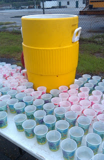 It is the things you find out at a run, helping hand out water to people struggling through a tough competition – how it takes teamwork to rapidly dispense a hundred cups of water in a span of five minutes, to clean up the aftermath, and to laugh at each other when you think the lid on the big water container is a screw-on and it ends up being a “pop off.” When you see people who you normally only encounter in business attire or a uniform, in sweats or shorts and a t-shirt instead, some of the differences that may be transmitted by our business attire evaporate.
