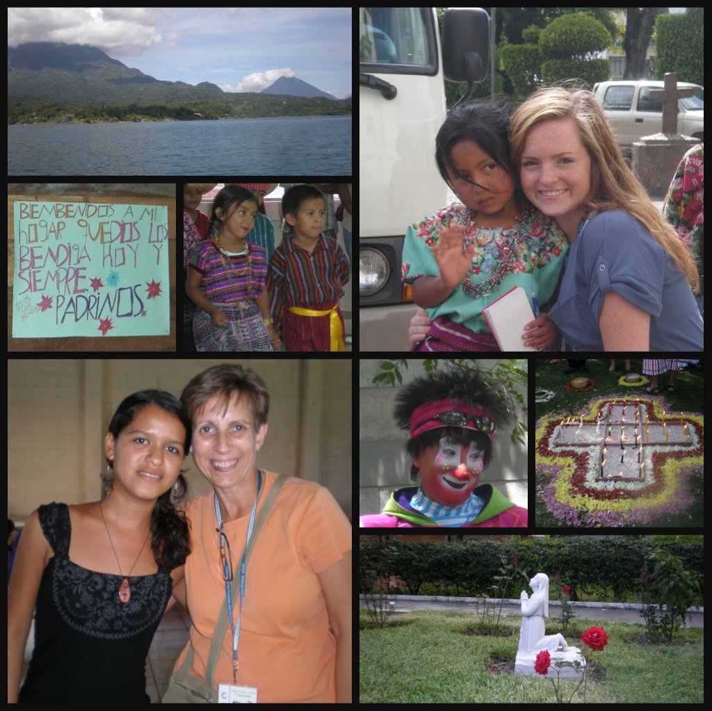 Working clockwise from the top left corner: Lake Atitlan; Tenley meets Estela, the child she is now sponsoring through Hope for a Family; the Mayan Prayer ceremony we participated in; a statue and roses at an orphanage in Guatemala City; I meet Silvia, the child our extended family has sponsored for 9 years; a sign on a Guatemalan family’s home welcoming us. In the center, two adorable Guatemalan children who danced for us at the orphanage, and Tutti Frutti the unforgettable clown.